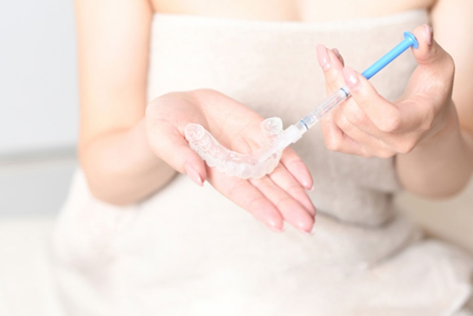 ホーム漂白剤として用いられる過酸化尿素ゲルは、かつて歯肉炎・歯周炎の治療薬として研究されていたものです。これを漂白用トレー(歯型をとって個人個人に合わせて作られた漂白専用のマウスピース)の内面に入れて歯に被せると過酸化尿素が徐々に分解して低濃度の過酸化水素が発生します。一日2~4時間のトレー装着を約2週間行います。作用がマイルドでオフィスブリーチよりも知覚過敏が少なく、透明感のある自然な白さが得られます。また、オフィスブリーチに比べると後戻りも少ないのが特徴です。