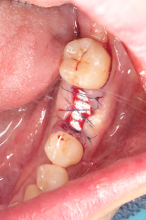 処置自体は抜歯と同日に行えることが多く、骨補填材を抜歯窩に填入した後、コラーゲンメンブレンや縫合で保護するという内容です。処置後は数ヶ月かけて材料が自分の骨へと置き換わっていき、顎の形態が安定します。