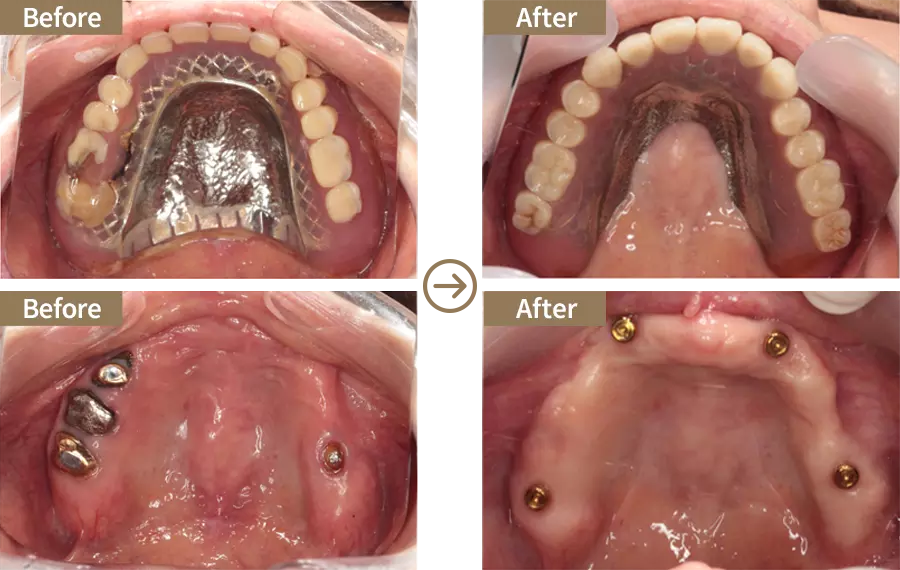 入れ歯が取れやすくくなったこと、うわ顎を覆わない入れ歯にしたいとの希望で、インプラントオーバーデンチャーを作製しました。