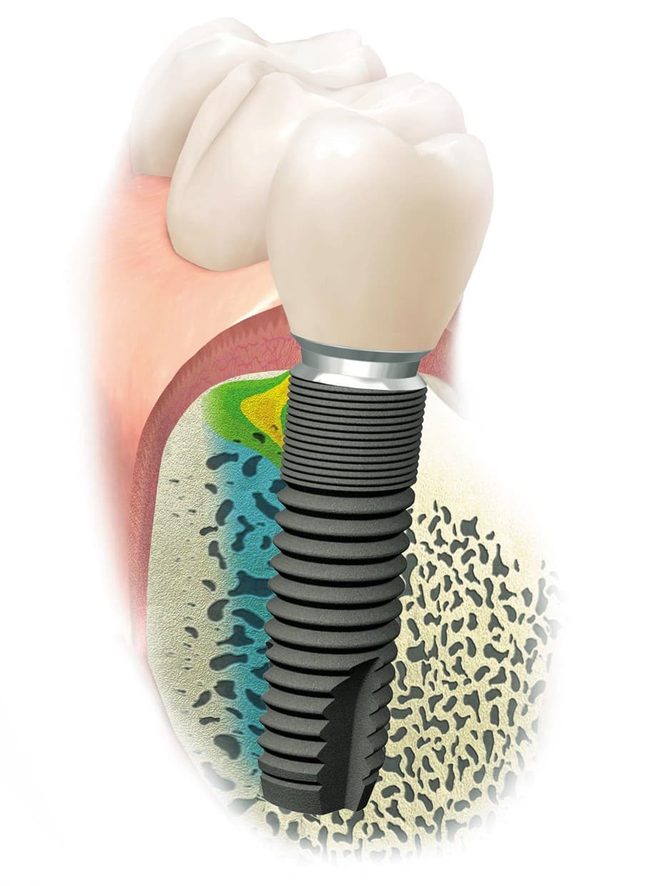 インプラント表面に細やかな加工を施し、親水性・化学的活性を高めることで、骨との結合(オッセオインテグレーション:骨がインプラントとくっつくこと)を促進します。実験データでは従来のSLA表面に比べて骨の生成が早く進んだという報告があります。