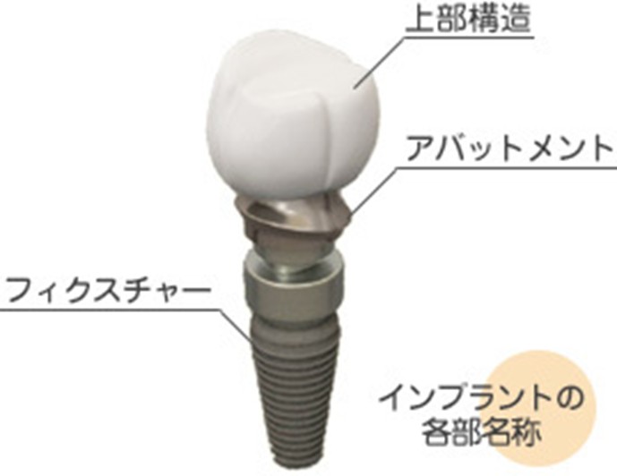 インプラントとは、歯を失ってしまった部分の治療法で、ブリッジや入れ歯同様歯の欠損を補う治療オプションの一つです。顎の骨にチタン製のネジ状の金属を埋め込み、そこへ上部構造としてアバットメントという土台とかぶせ物を装着し、歯と同様に使用するものです。